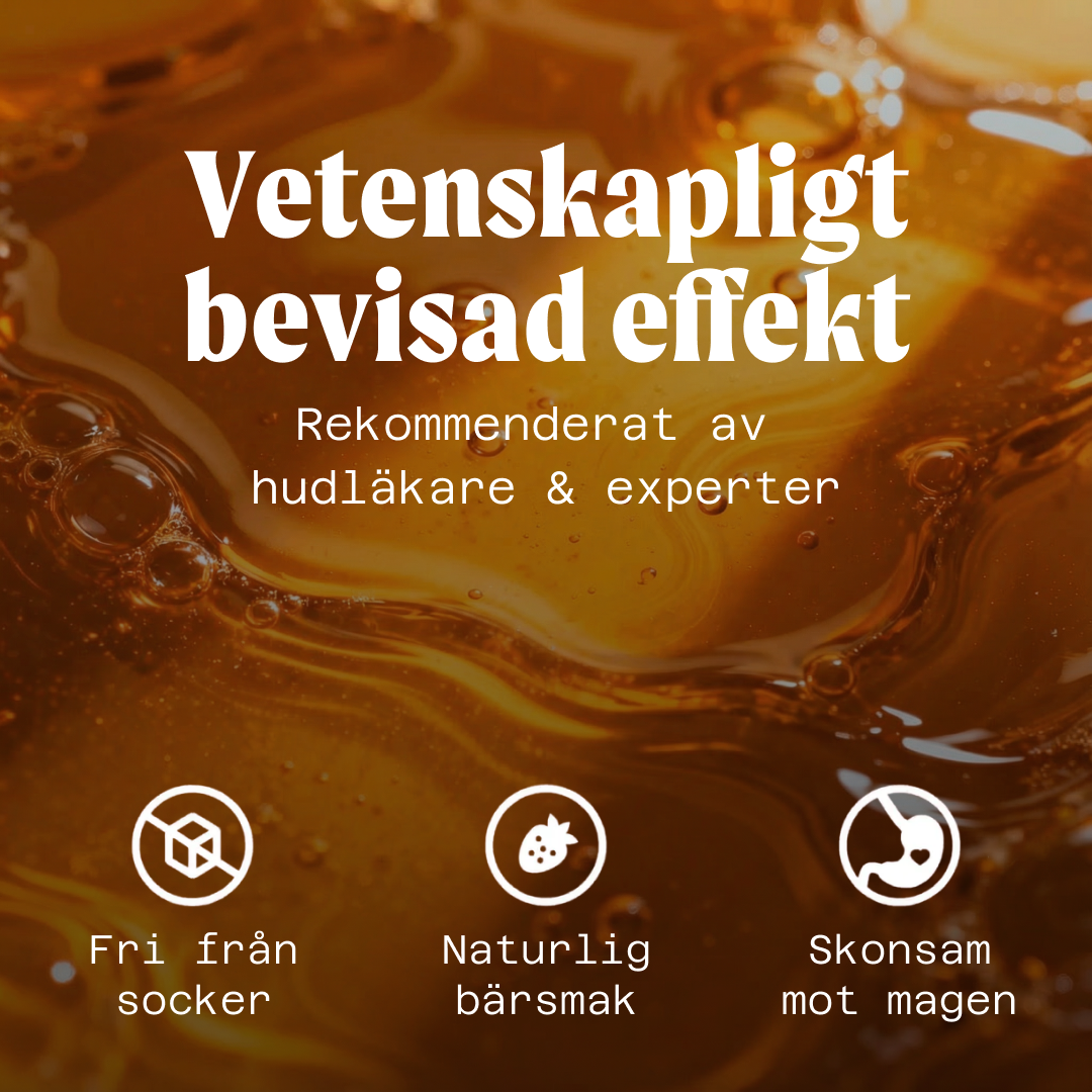 Retinol hjälper kroppen att aktivera de processer som bildar nytt kollagen och elastin. Det kan också stödja cellförnyelsen så att huden känns jämnare med tiden. Retinol i kräm kan vara irriterande för många, men i den här formulan får du stödet inifrån – utan den vanliga risken för rodnad eller flagning.