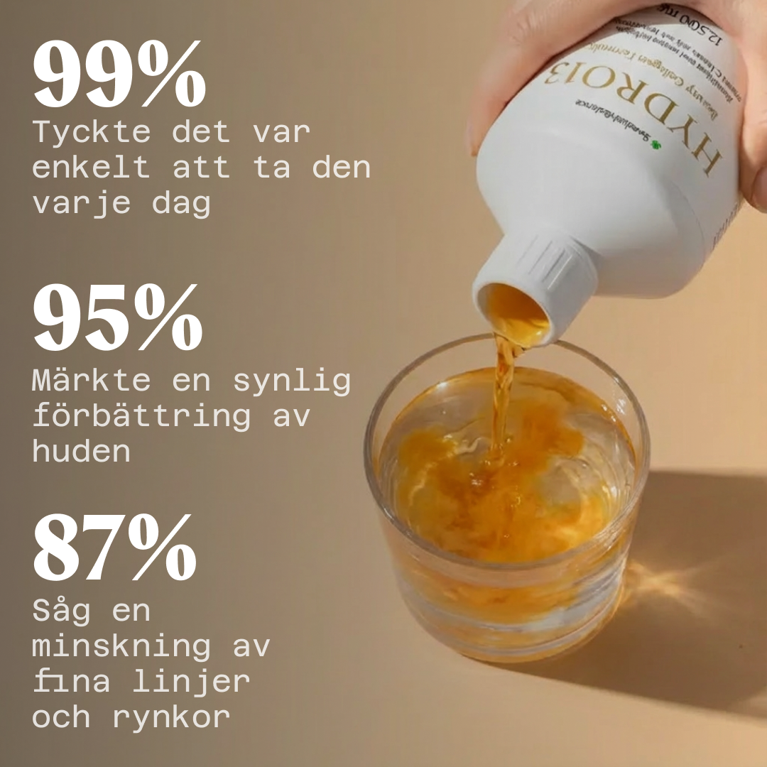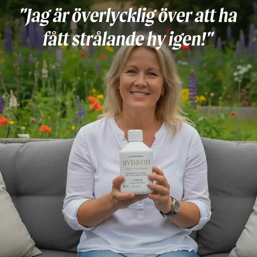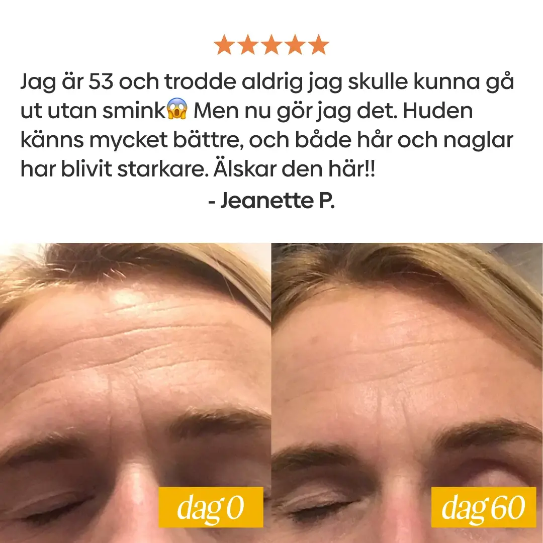 Strålande hud! Min hud har förbättrats avsevärt sedan jag började med ert kollagen. Rynkorna är inte alls så djupa längre och huden är smidig och strålande. Jag är supernöjd!