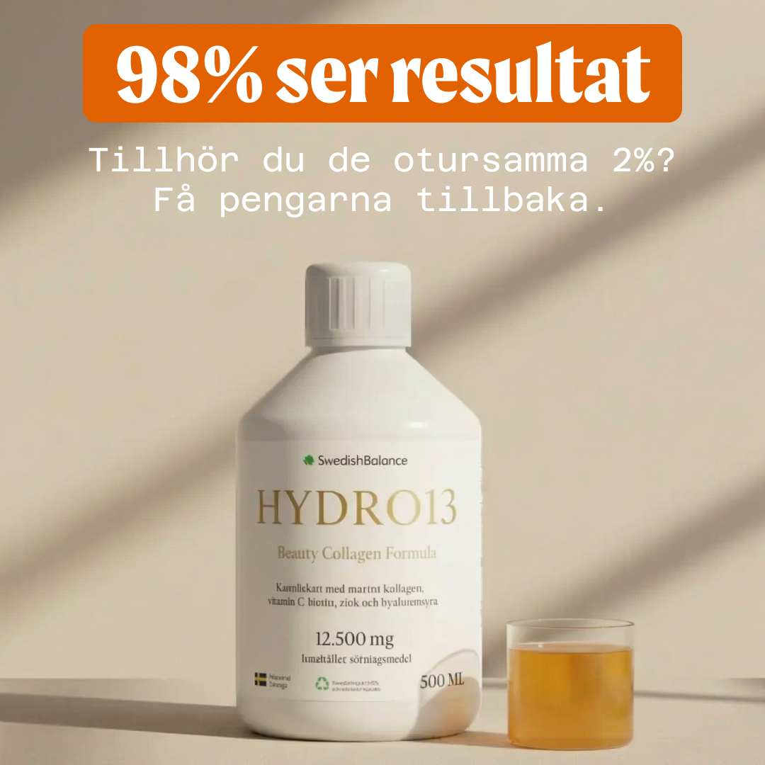 Ta Hydro13 varje dag i 99 dagar. Om du inte ser någon skillnad vill vi inte ha dina pengar. Vi vet att Hydro13 ger riktigt fina resultat för de flesta, men alla är olika. Därför kan du testa helt utan risk.